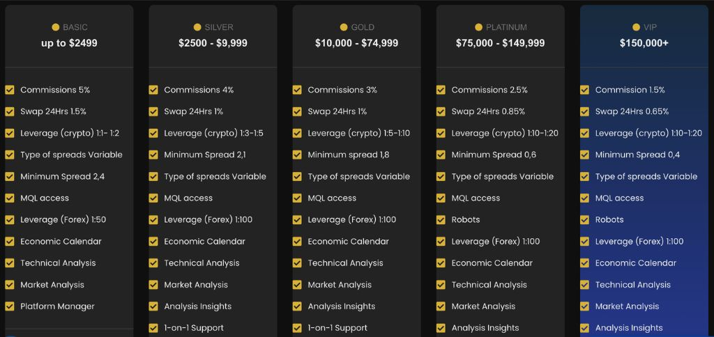 • Базовый: депозит $2 500, комиссии 5%, своп 1,5%, кредитное плечо 1:2 (криптовалюта) / 1:50 (форекс), спреды 2,4 пункта.