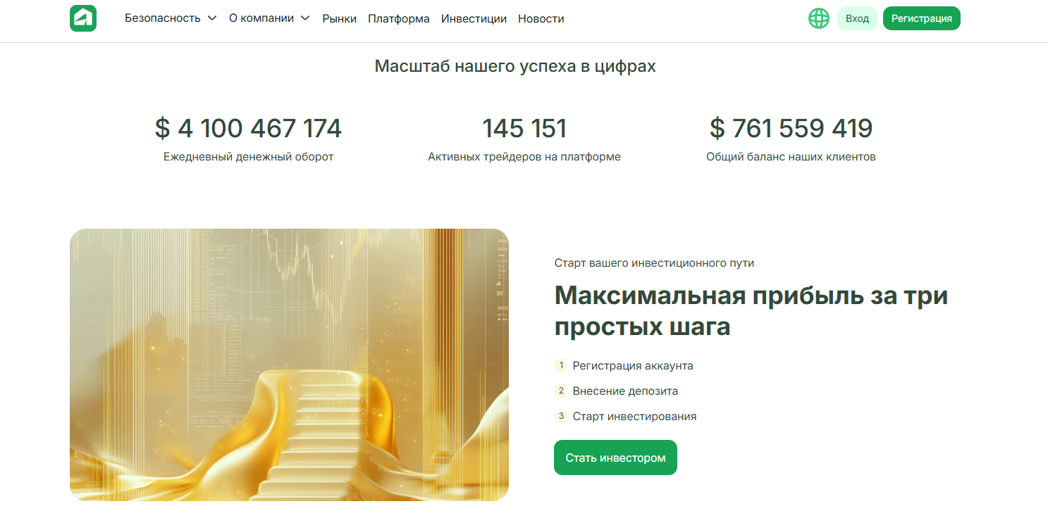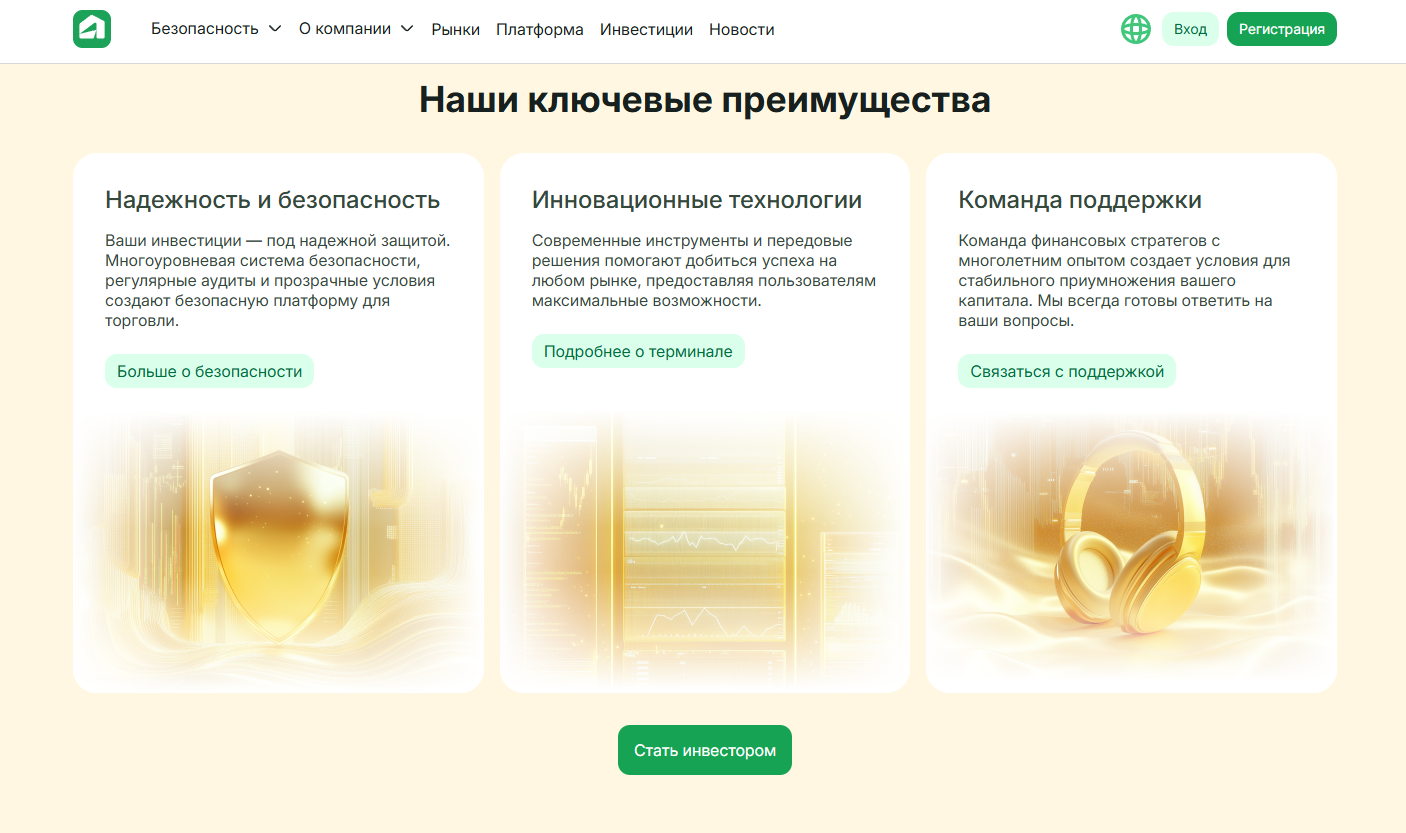 2. Advanced – минимальный депозит от $1 000, расширенные возможности платформы, доступ к торговле криптовалютами, аналитические материалы, персональный менеджер, плечо до 1:500; также заявлено наличие страховки (детали не раскрыты).
