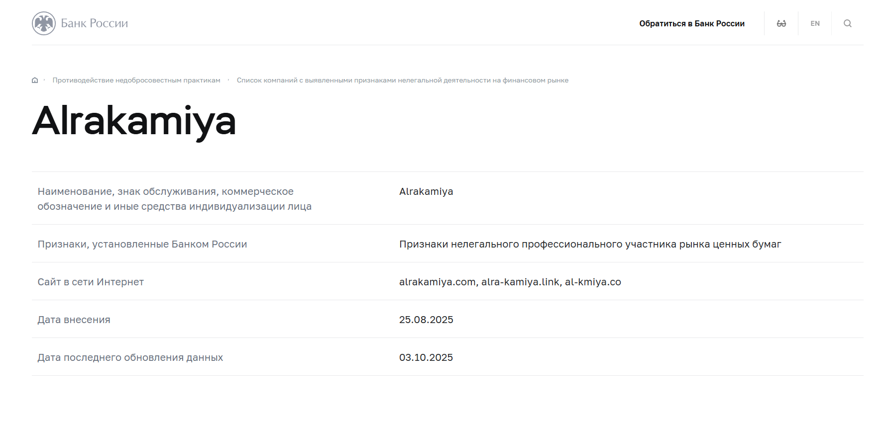 Банк России внёс Alrakamiya в свой официальный перечень компаний с признаками незаконной деятельности на финансовом рынке. 25 августа 2025 года в реестр Банка России была добавлена запись по Alrakamiya (доменa alrakamiya.com, alra-kamiya.link, al-kmiya.co) с пометкой о «признаках нелегального профессионального участника рынка ценных бумаг». Это означает, что Alrakamiya не имеет лицензии на брокерскую деятельность в России и работает с нарушением закона. Подобные предупреждения часто сопровождаются блокировкой сайта на территории РФ – действительно, имеются сведения, что доступ к alrakamiya.com мог быть ограничен интернет-провайдерами по требованию надзорных органов.