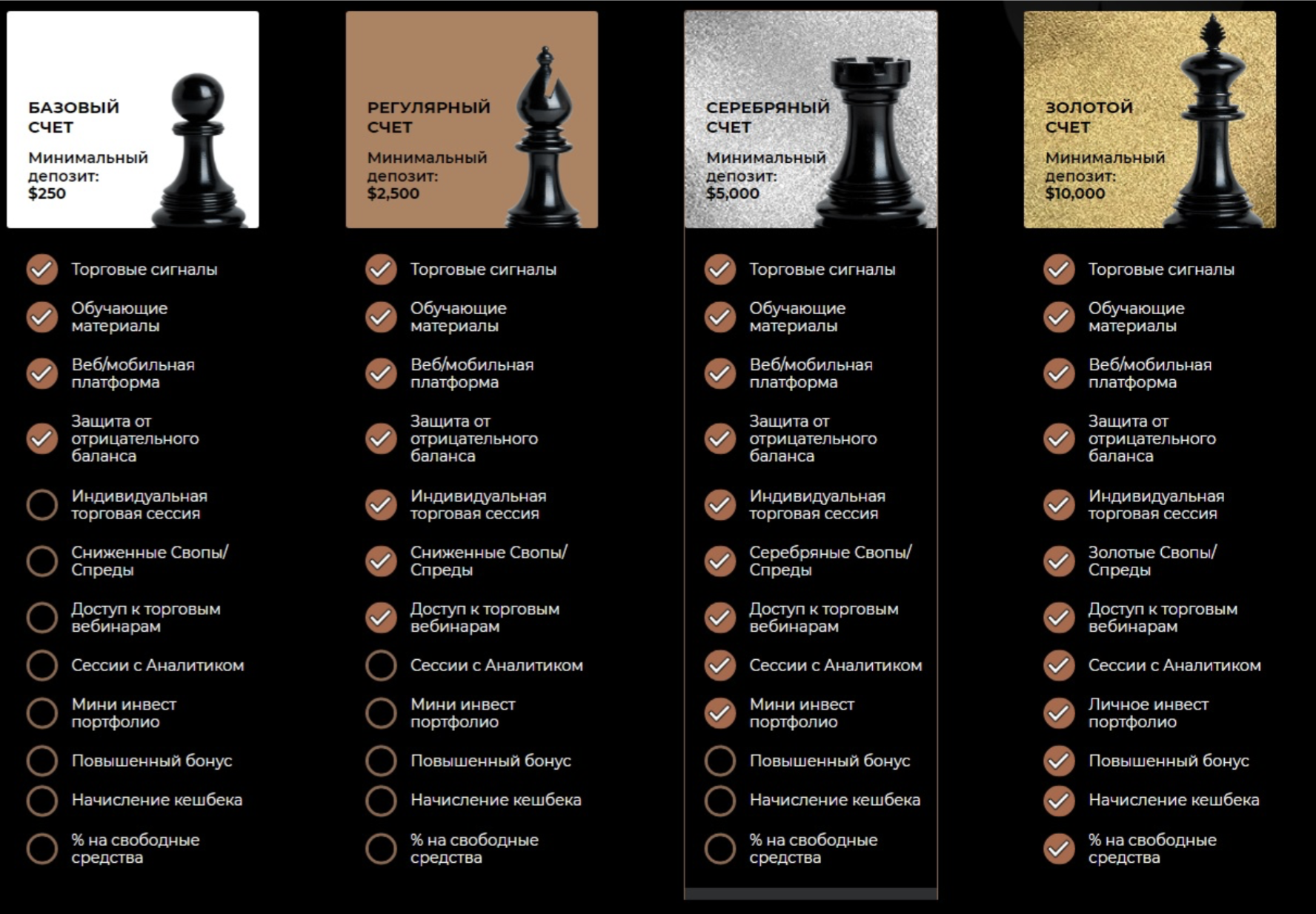 Брокер предлагает нам 4 типа аккаунтов. Каждый тип аккаунта отличается набором функций и преимуществ, что позволяет подобрать тип счета под ваши потребности и опыт.