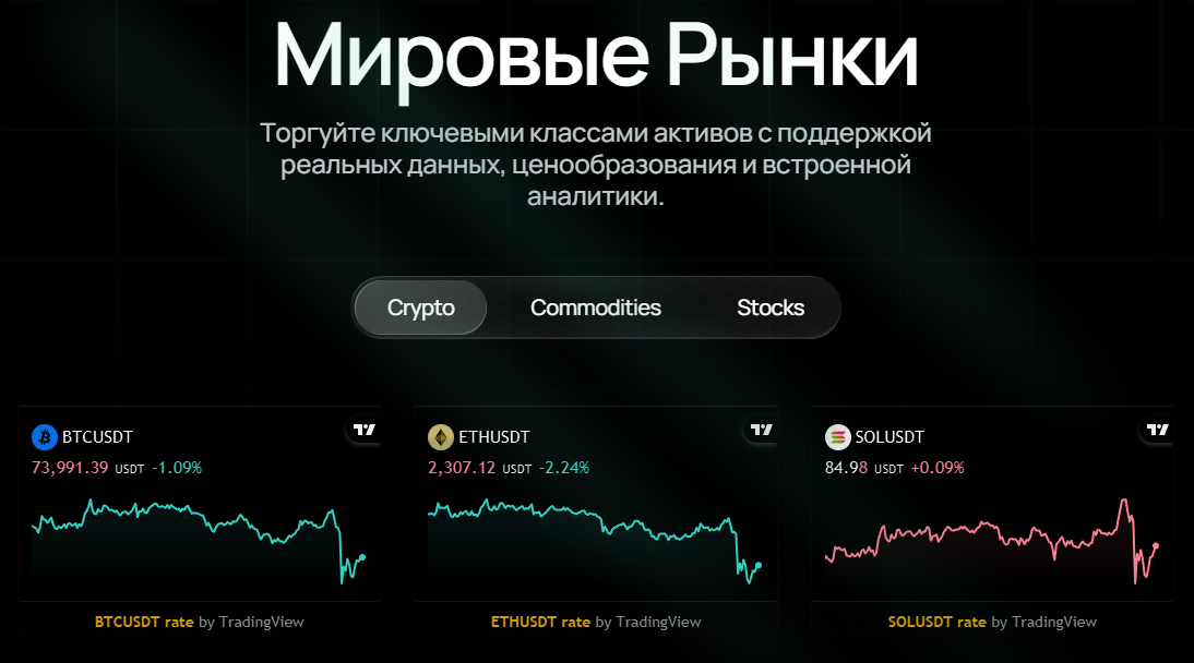 BloomX предоставляет доступ к трём основным группам активов – криптовалютам, акциям и товарам. Такой набор охватывает наиболее востребованные направления частной торговли и позволяет работать с рынками разного характера, от высоковолатильных цифровых активов до более устойчивых инструментов, которые часто используют для диверсификации. С одной стороны такое количество активов вполне достаточно для обычного трейдера чтобы не запутывать его излишними опциями, однако для самый опытных участников рынка этого ассортимента может быть мало.