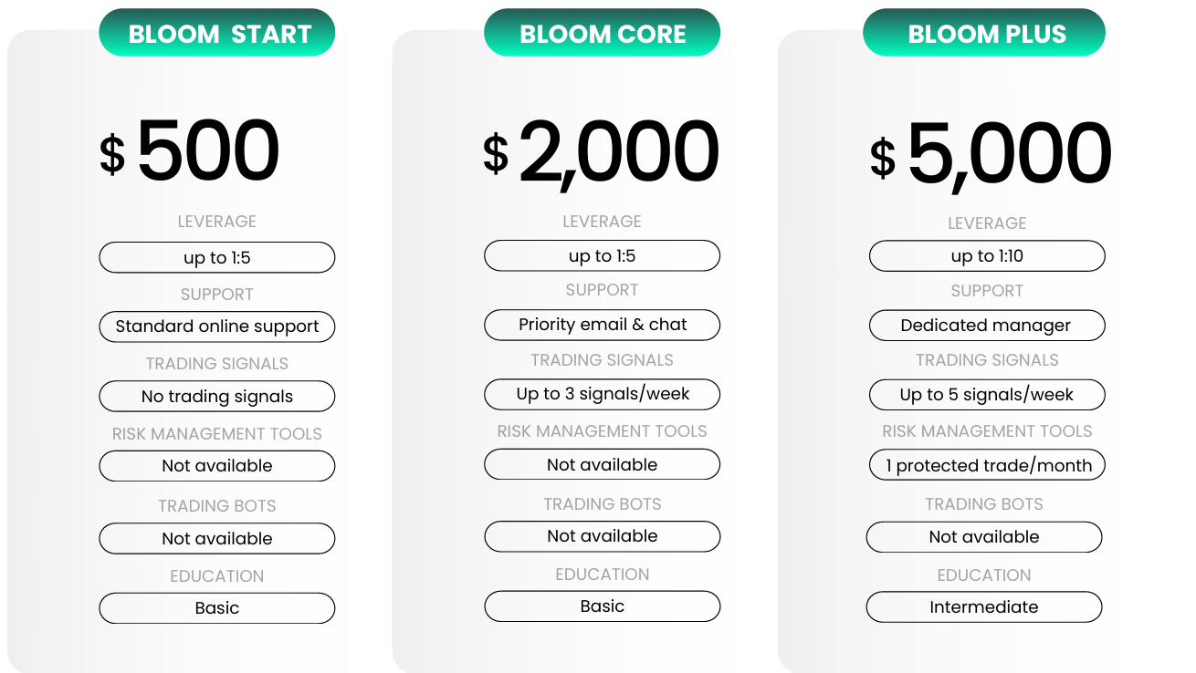 Линейка счетов у BloomX выстроена по классической восходящей модели: чем выше депозит, тем шире набор доступных сервисов. Вход начинается с $500 и плеча до 1:5. На базовом уровне пользователь получает доступ к рынку, стандартную поддержку и обучение без дополнительных инструментов.