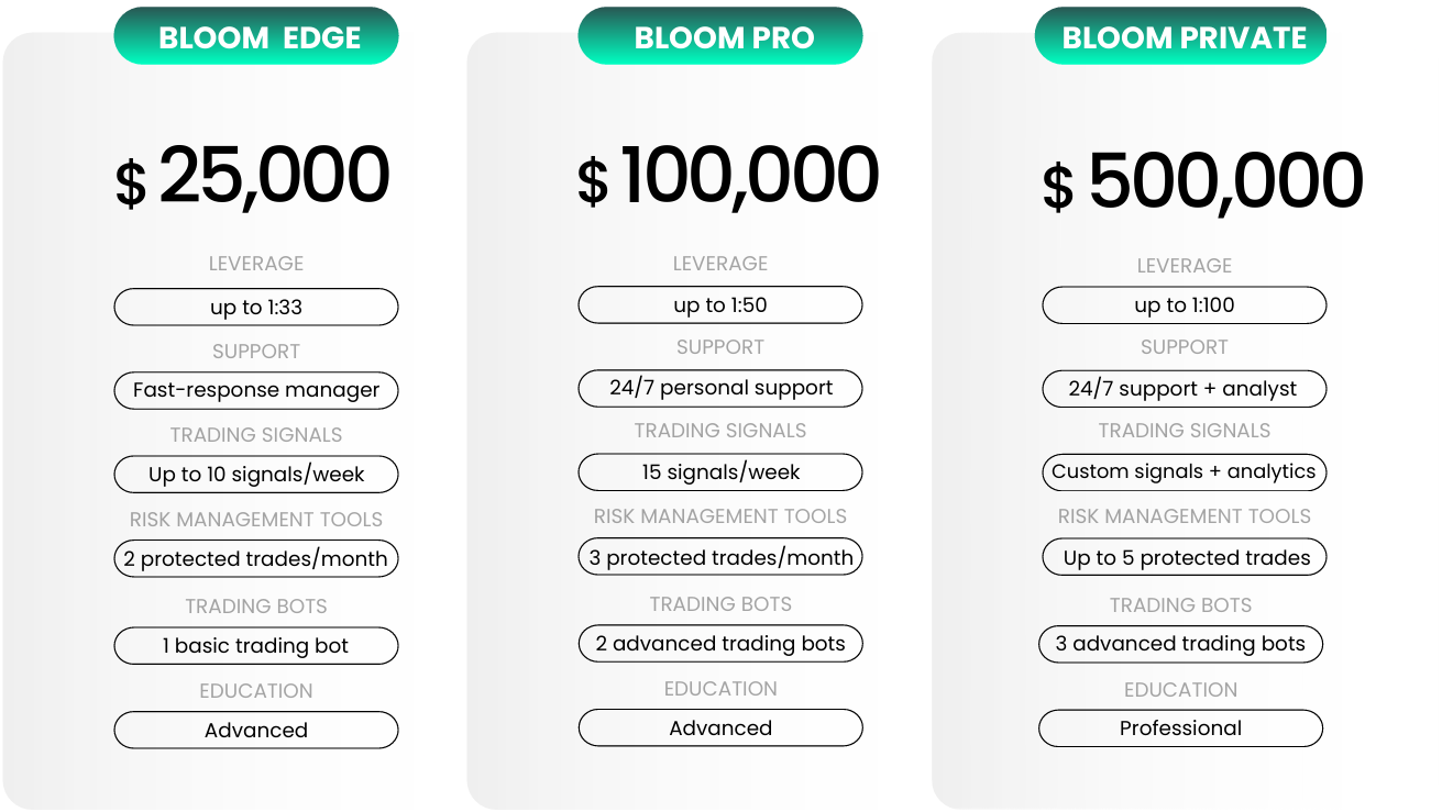 Одна из сильных сторон BloomX – последовательная структура сервиса. По мере роста депозита расширяется не только уровень поддержки, но и набор рабочих инструментов: добавляются торговые сигналы, персональное сопровождение, защищённые сделки и торговые боты. Такой подход делает линейку счетов более практичной и понятной.
