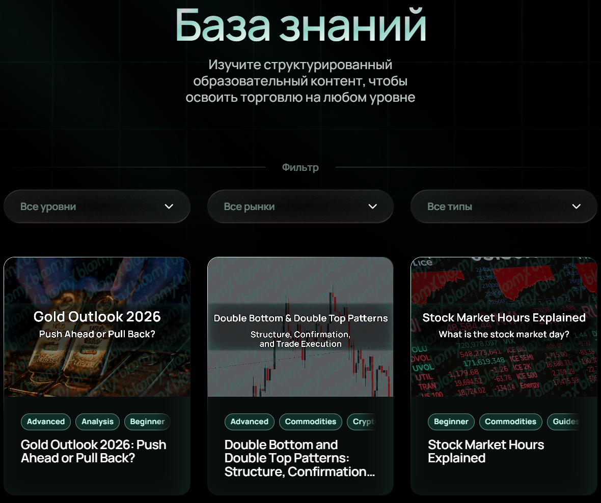 BloomX Corp Academy – образовательный и аналитический раздел сайта брокера. Внутри платформы доступны обучающие статьи, структурированные уроки, обзоры рынка, аналитический контент, вебинары для зарегистрированных пользователей и внутренняя библиотека материалов. Обучение разделено по уровням и тематикам, для более простой навигации по библиотеке сайта.
