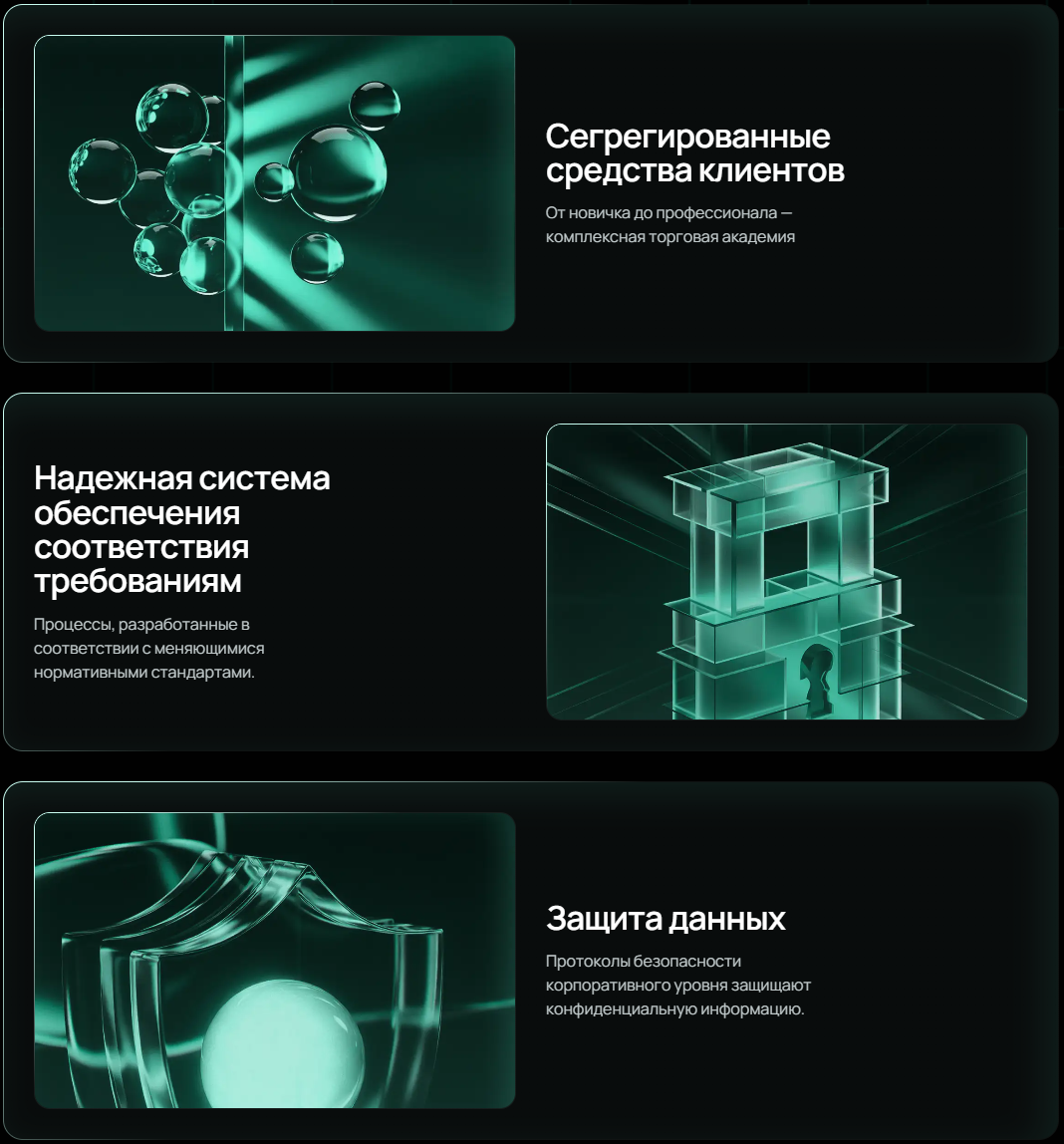 На практике это означает базовый набор мер, которого ожидают от брокерской инфраструктуры. Ваши средства не будут смешиваться со случайными транзакциями и будут принадлежать только вам. Также компания выполняет требования AML, предотвращая отмывание средств через свои счета. И работает с KYC (Know Your Customer — «знай своего клиента») системой, обычно это практикуется чтобы также не допустить на платформу мошенников, людей отмывающих средства и прочих подозрительных акторов.