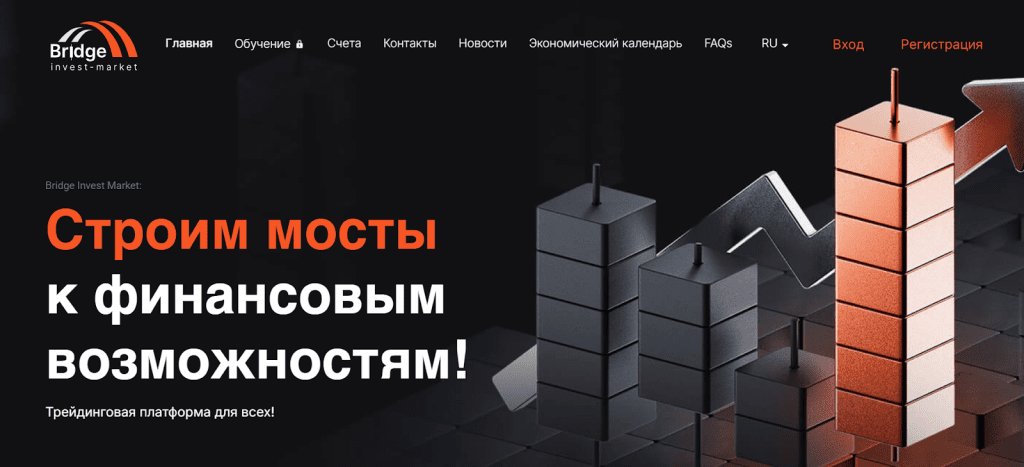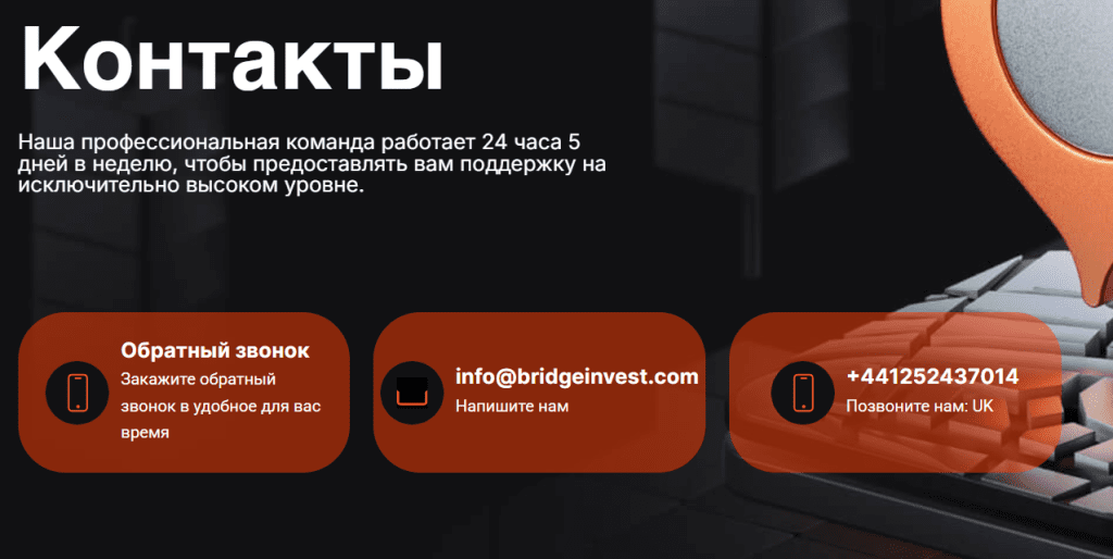 Первое, что бросается в глаза при знакомстве с Bridge Invest Market, — полное отсутствие прозрачности. На сайте компании нет раздела «О нас», где можно было бы узнать о ее истории, команде или достижениях. Это уже вызывает подозрения, ведь серьезные брокеры всегда открыто рассказывают о себе, чтобы завоевать доверие клиентов.