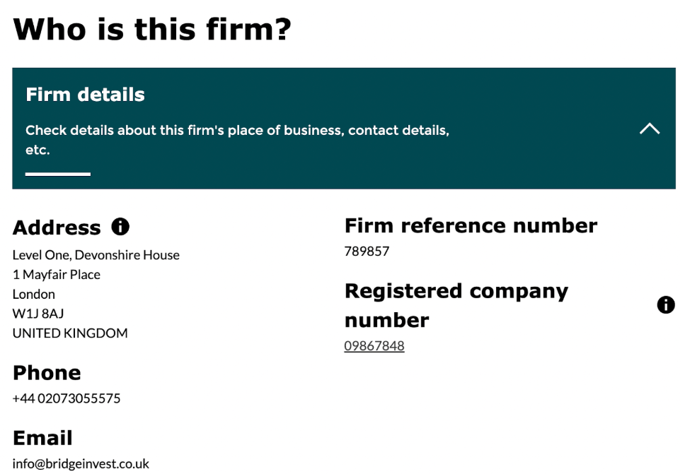 Bridge Invest Market позиционирует себя как регулируемая компания и даже предоставляет ссылку на лицензию FCA (Управления по финансовому регулированию и надзору Великобритании). Однако при ближайшем рассмотрении выясняется, что лицензия принадлежит совершенно другой организации — bridgeinvest.co.uk.