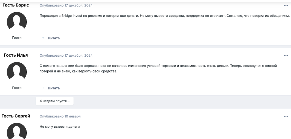 Отзывы о Bridge Invest Market — это сплошной поток жалоб и предупреждений. Пользователи рассказывают, что брокер использует манипуляции с торговым терминалом, чтобы создать иллюзию успешных сделок. Сначала клиенты видят прибыль, что мотивирует их вносить больше средств. Но как только сумма депозита становится достаточно крупной, доступ к аккаунту блокируется, а поддержка перестает отвечать на запросы.