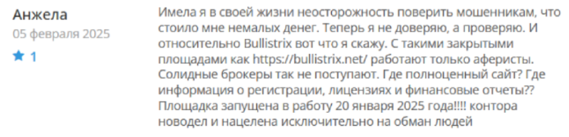 Bullistrix пока не вызывает доверия. Новый сайт, мутная репутация, непрозрачные условия и тревожные отзывы рисуют портрет брокера, который больше нацелен на сбор денег, чем на качественный сервис. Отсутствие регулирования и признаки сомнительных практик только усиливают опасения. Сотрудничество с ним выглядит рискованным шагом — лучше присмотреться к платформам с подтвержденной историей и гарантиями. Решайте сами, но осторожность здесь явно не будет лишней.