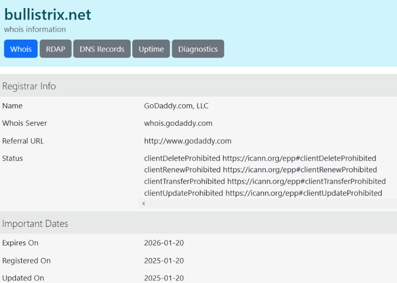 Bullistrix заявляет о себе как о торговой платформе, но его история мутная. Домен bullistrix.com появился в январе 2025 года, что говорит о молодости. Это не приговор, но настораживает в сочетании с другими фактами. Данные о владельцах, адресе и руководстве скрыты — надежные брокеры так не делают. В сети уже есть предупреждения от аналитиков и регуляторов о возможных проблемах с лицензиями. Пока Bullistrix — новичок без доказательств своей честности.