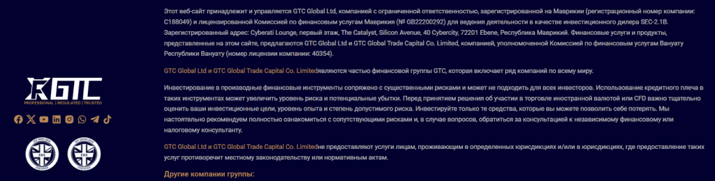 Также стоит отметить отсутствие лицензий от ключевых и уважаемых регуляторов, таких как FCA (Великобритания), CySEC (Кипр), ASIC (Австралия), ESMA (ЕС) или Банк России. В результате, деятельность GTCFX в большинстве стран — в том числе и на территории ЕС и СНГ — осуществляется фактически незаконно.