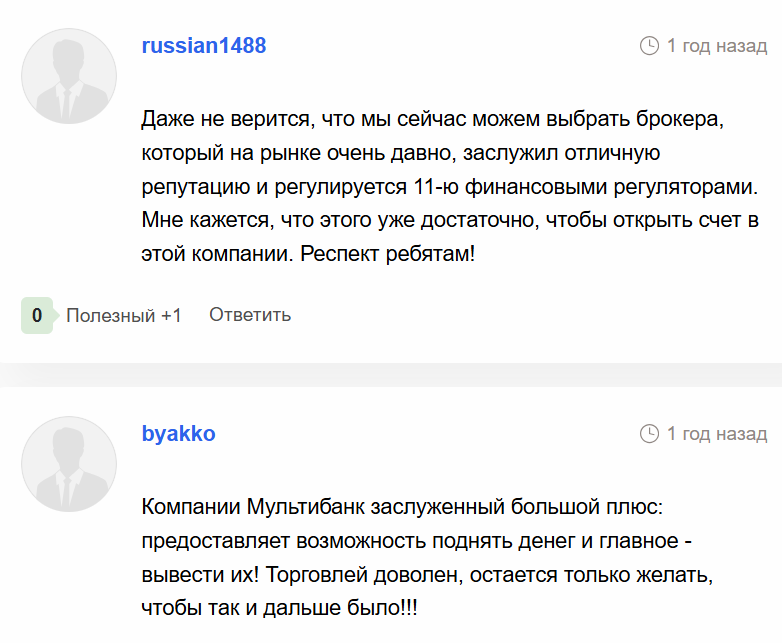Большинство трейдеров отмечают высокий уровень надежности MultiBank Group, а также качественную поддержку клиентов. Пользователи хвалят широкий выбор инструментов и низкие спреды, особенно на ECN-счетах. Однако некоторые трейдеры отмечают, что минимальный депозит на профессиональных счетах может быть высоким для новичков.