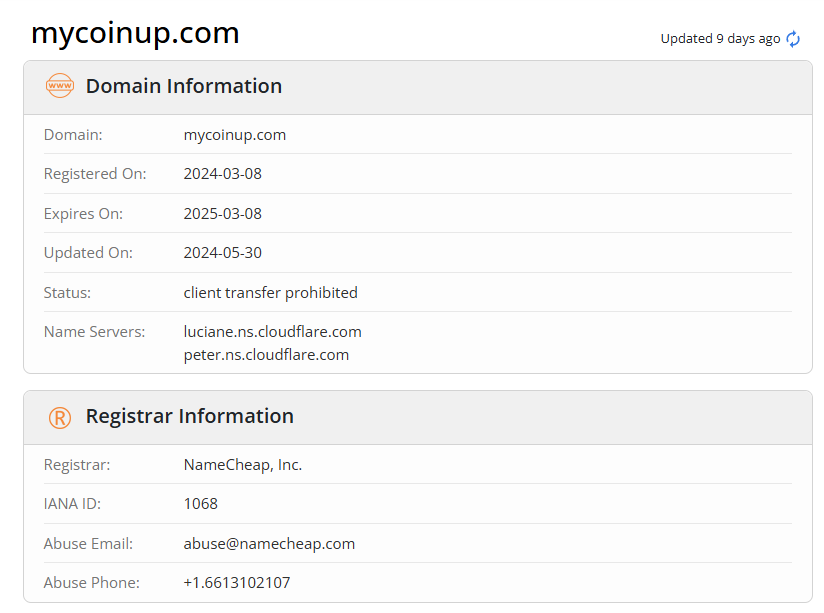 • Домен mycoinup.com зарегистрирован 8 марта 2024 года и истекает 8 марта 2025 года, что не соответствует заявленному 10-летнему опыту. Надежные брокеры регистрируют домены на долгий срок.