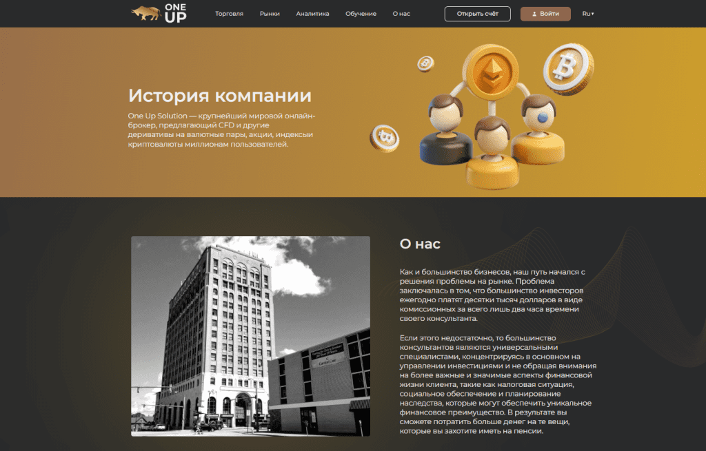 One Up Solution — это онлайн-брокер, который заявляет о своей глобальной репутации и предлагает торговлю контрактами на разницу (CFD) и другими деривативами, включая валютные пары, акции, индексы и криптовалюты. На первый взгляд, компания выглядит как типичный игрок на финансовых рынках, предоставляя множество торговых инструментов и обещая клиентам высокие прибыли. Однако после более детального исследования возникает множество вопросов и сомнений относительно ее реальной деятельности.