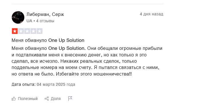 Если вы уже стали жертвой One Up Solution, немедленно прекратите любые взаимодействия с этим брокером и постарайтесь вернуть свои средства через официальные каналы, если это возможно.