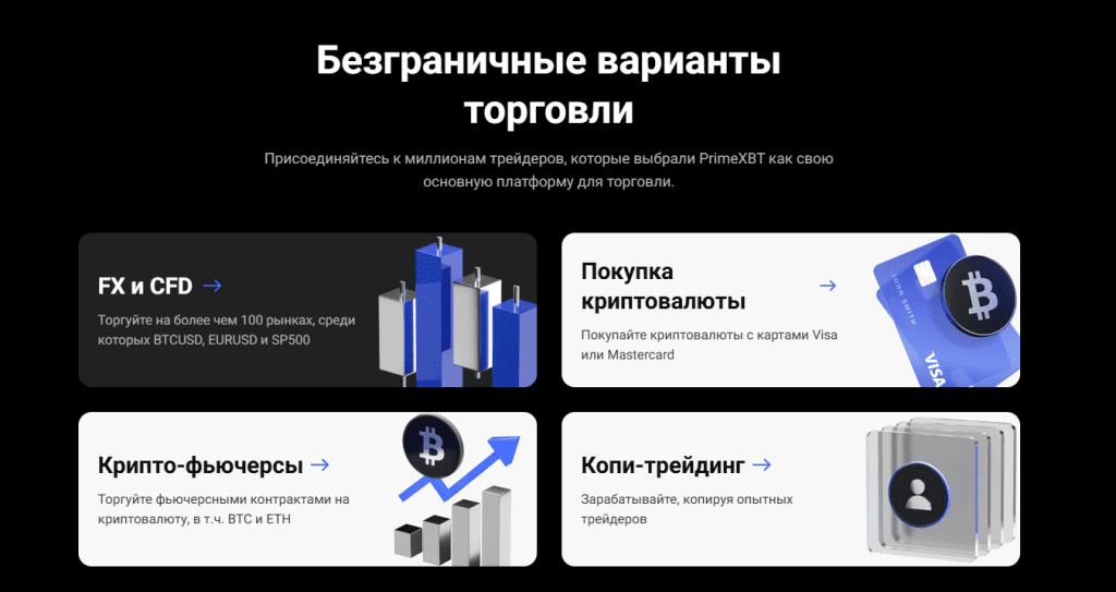 PrimeXBT представляет собой централизованную торговую платформу, которая объединяет криптовалютные фьючерсы, CFD и маржинальную торговлю. Платформа ориентирована как на опытных трейдеров, так и на новичков, предлагая удобный интерфейс и различные инструменты для торговли. На сегодняшний день PrimeXBT обслуживает более миллиона пользователей в более чем 150 странах, и, судя по отзывам, большинство клиентов довольны ее работой.