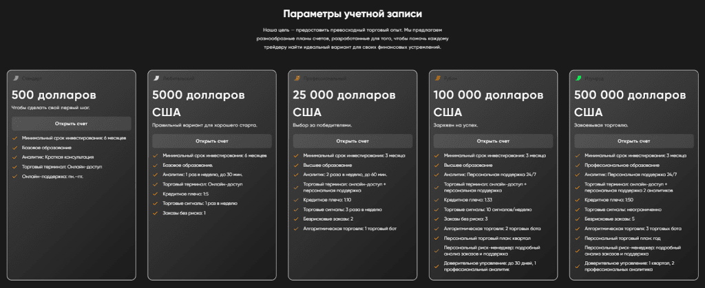 Каждый тип счёта имеет свои особенности по минимальному депозиту, уровню доступа к дополнительным услугам и условиям сопровождения: