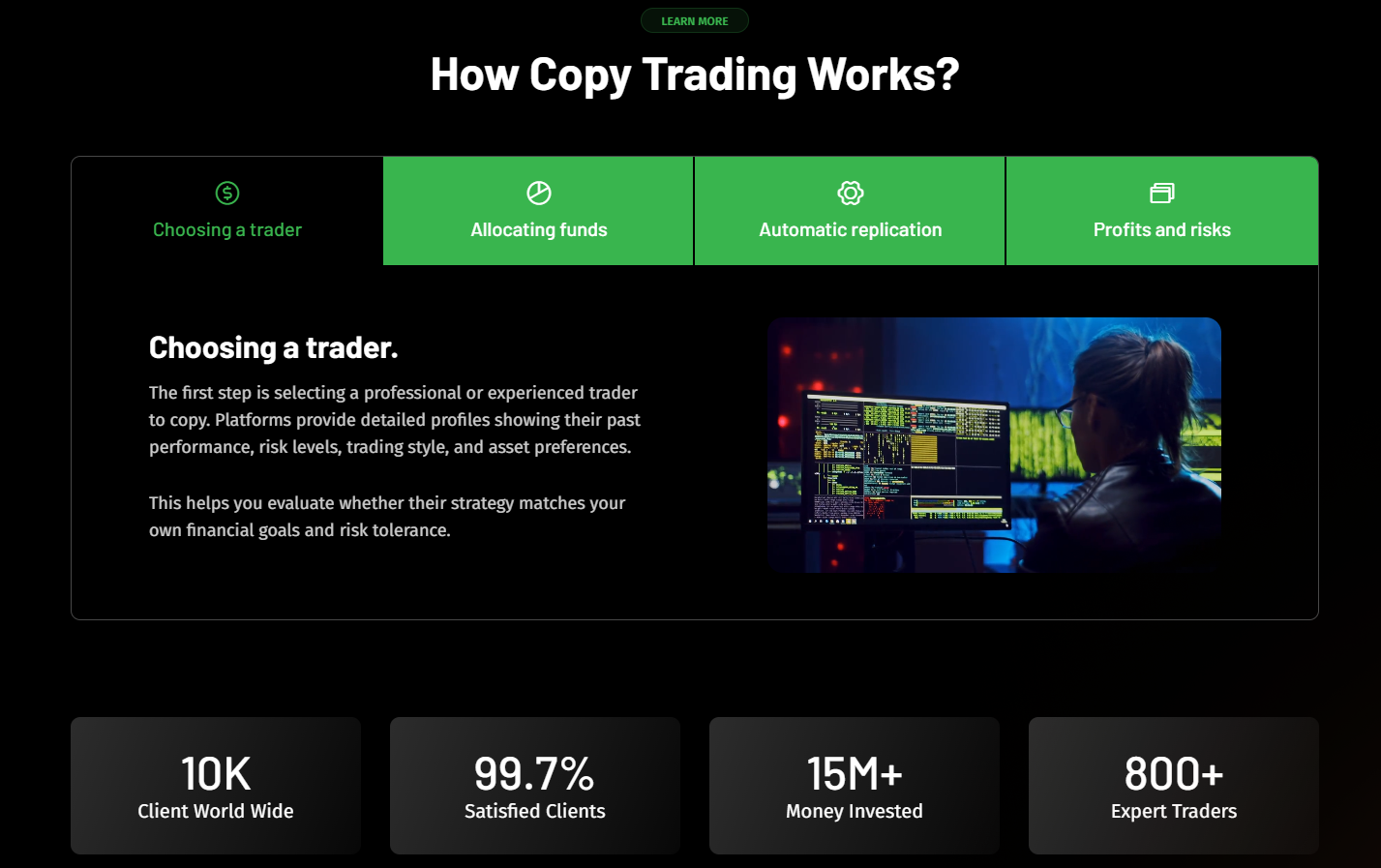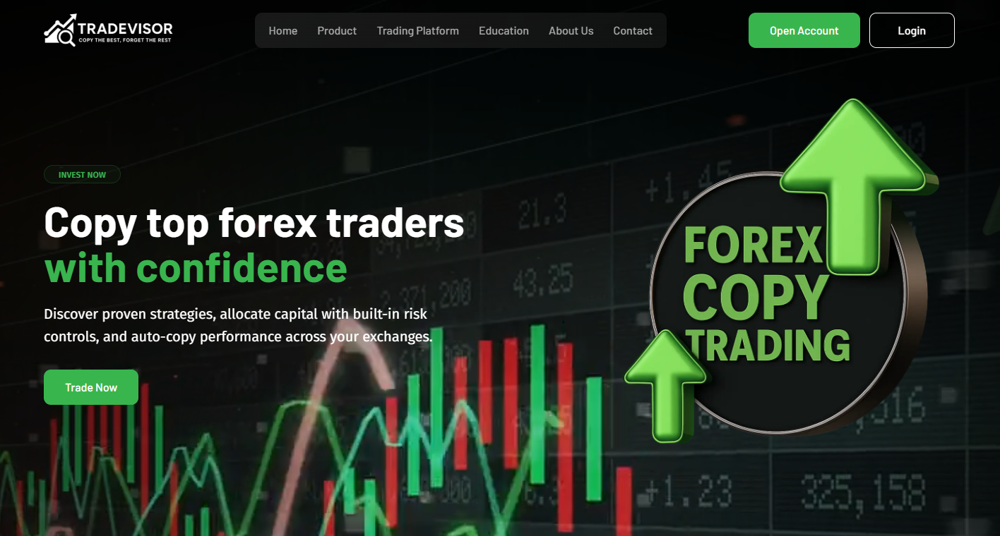 TradeVisor (tradevisor.ai) позиционирует себя как платформу для копитрейдинга и автоматической торговли на финансовых рынках. На сайте используются стандартные формулировки про профессиональных трейдеров, управление рисками и доступность для новичков.
